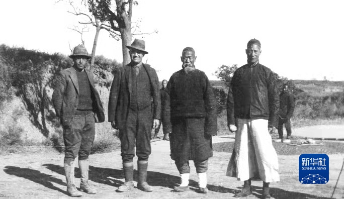 安特生(左二)在仰韶村首次发掘时的留影(资料照片)。新华社发(三门峡市委宣传部提供)