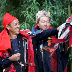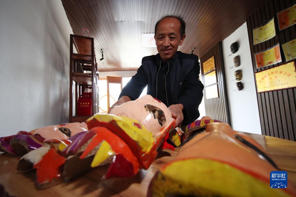 10月17日,肖光华挑选思州傩戏傩技表演用的面具。新华社发(胡攀学 摄)