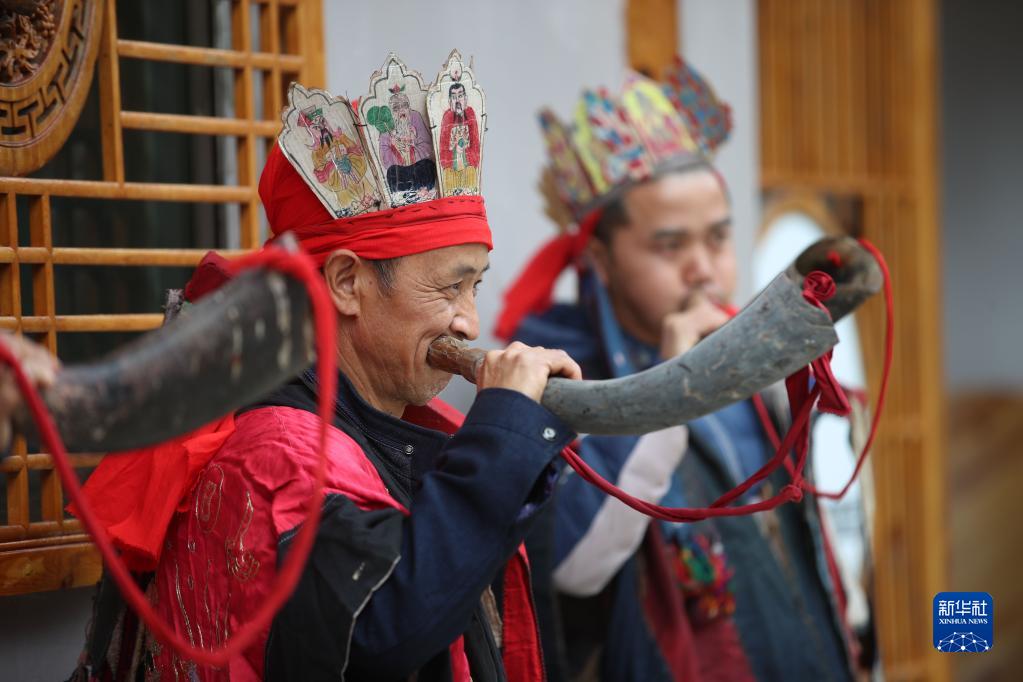 10月17日,肖光华(右二)和徒弟在岑巩县平庄镇平庄村表演思州傩戏傩技。新华社发(胡攀学 摄)