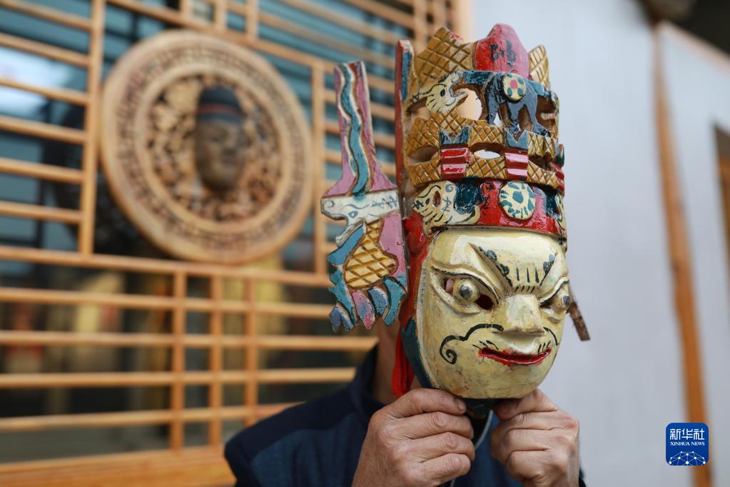10月17日,在岑巩县平庄镇平庄村,肖光华在表演前佩戴面具。新华社发(欧秀灯 摄)