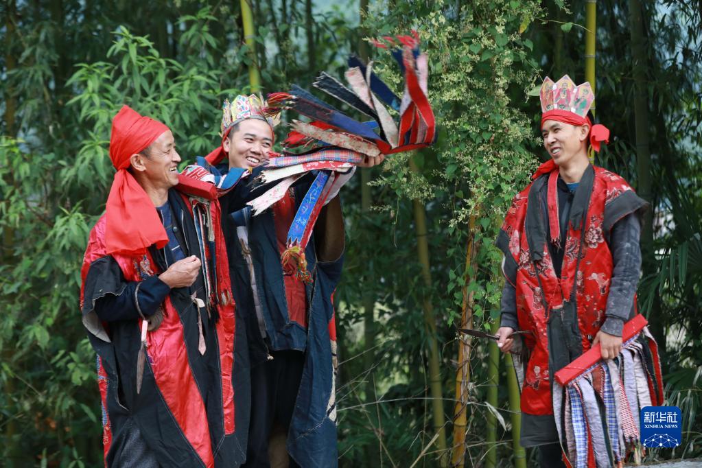 10月17日,肖光华(左)指导徒弟表演思州傩戏傩技。新华社发(欧秀灯 摄)