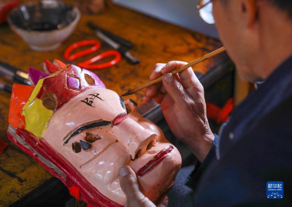 10月17日,肖光华制作思州傩戏傩技表演用的面具。新华社发(欧秀灯 摄)