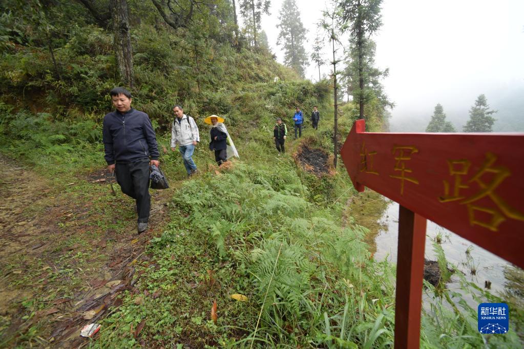 10月17日,在台江县方召镇巫脚交村,守墓人张勇才(左一)与县里的干部走在去祭拜无名红军烈士的路上。