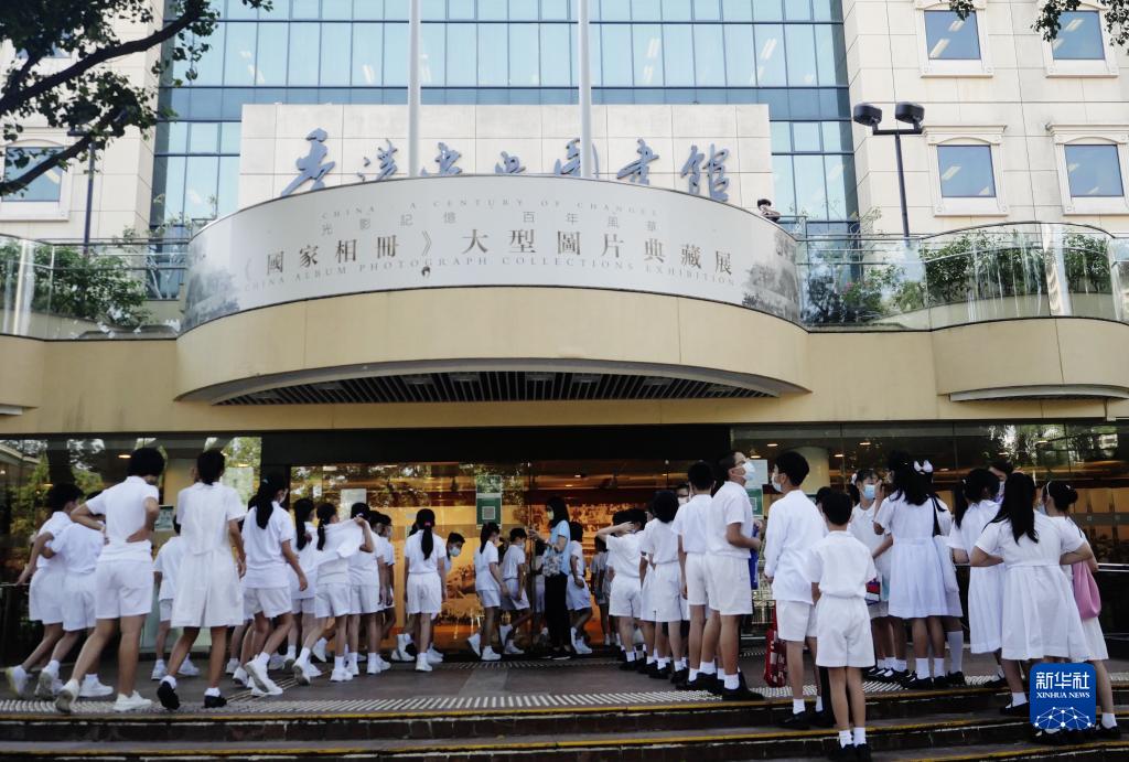 在香港中央图书馆,香港小学生排队入场准备参观(10月11日摄)。新华社记者 王申 摄