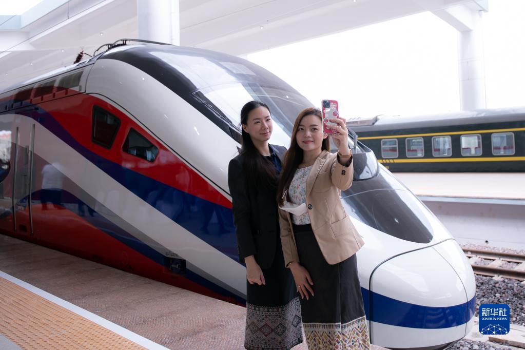 10月16日,皮雅努(左)与朋友在老挝首都万象火车站与“澜沧号”动车组合影,皮雅努在中老铁路有限公司新闻部工作。