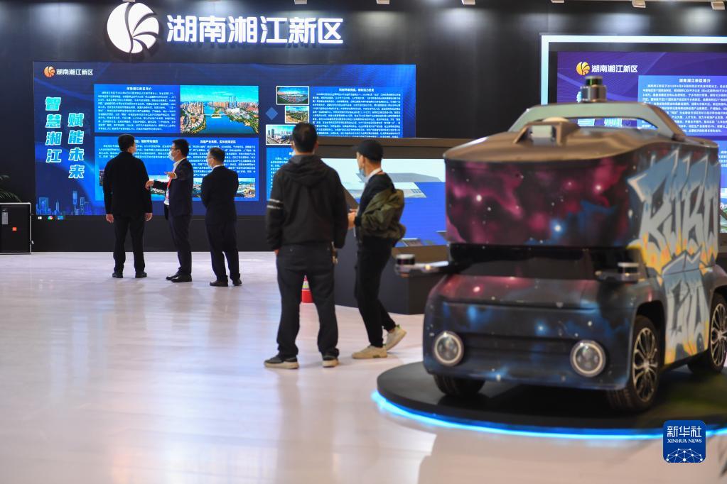 10月18日,参观者在博览会的“湖南湘江新区”展区参观。