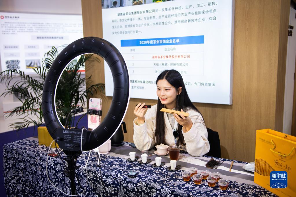10月18日,在长沙国际会议中心,工作人员在直播推销茶叶。