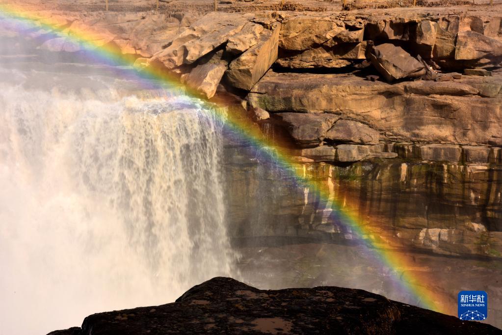 当日,雨后初霁的黄河壶口瀑布出现“彩虹飞瀑”景象。