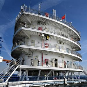10月18日,参观者在“耕海1号”海洋牧场综合体平台上参观。