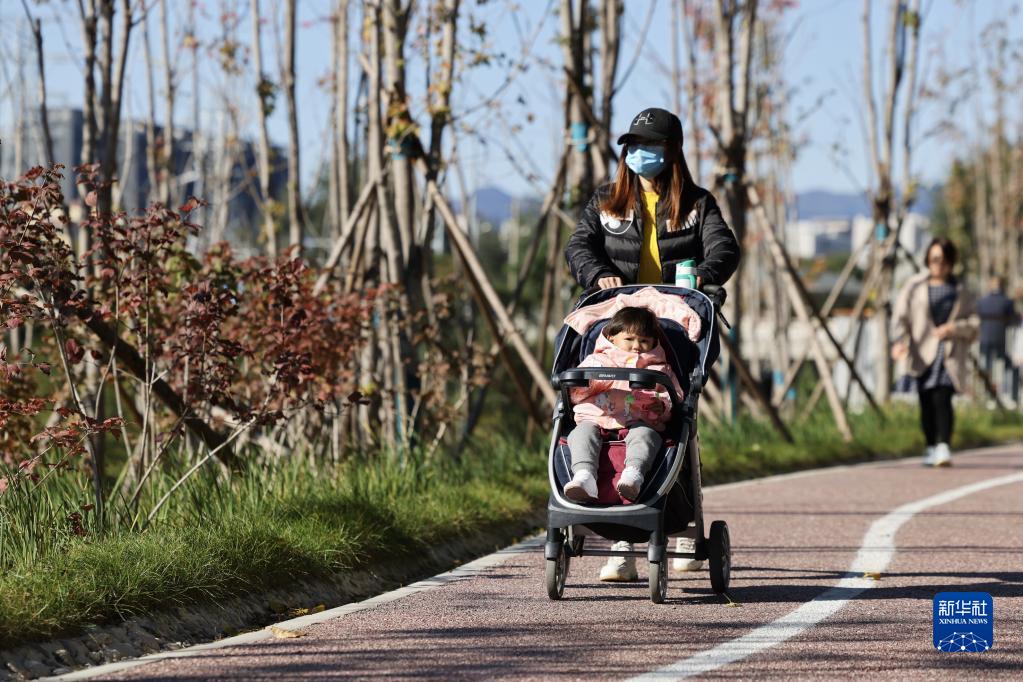10月19日,市民在北京永定河引水渠旁的体育活动场地游玩。