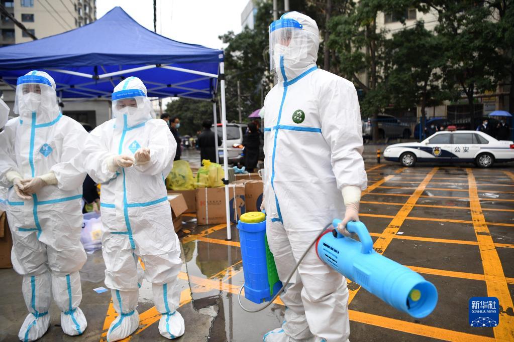10月19日,在兰州市城关区民主西路小学核酸检测点,医务人员准备对核酸检测点进行消杀。新华社记者 陈斌 摄