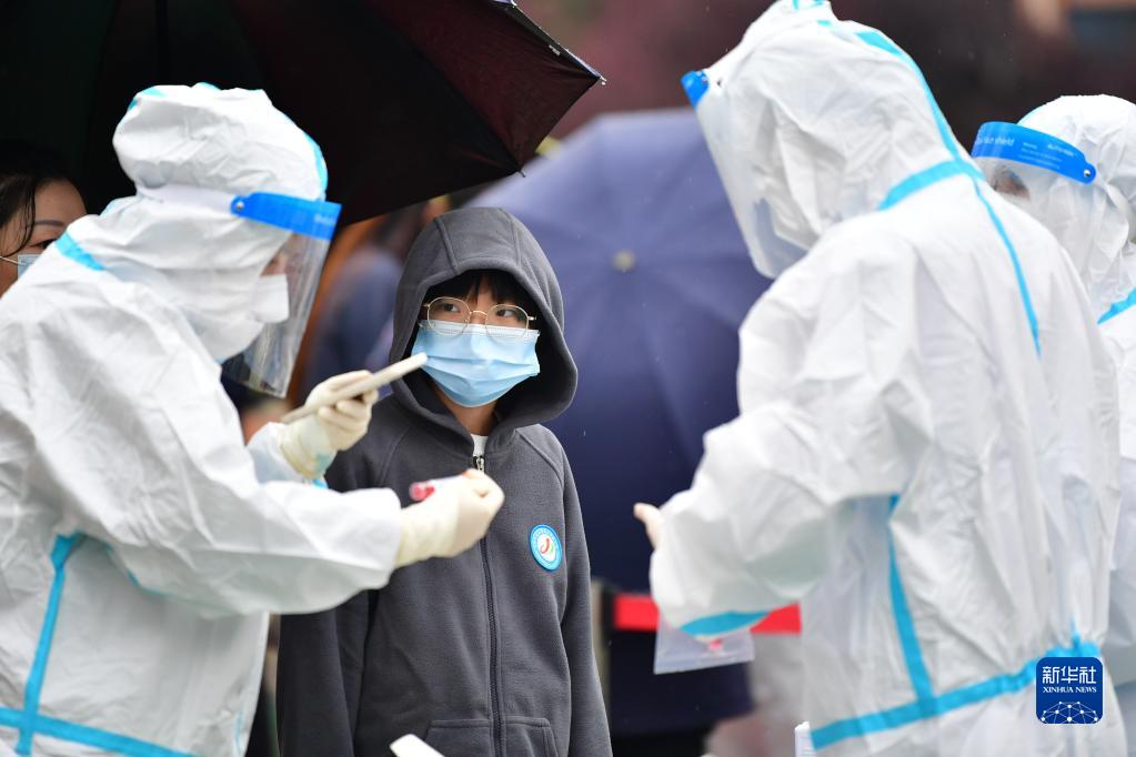 10月19日,在兰州市城关区民主西路小学核酸检测点,医务人员为居民做核酸检测。新华社记者 陈斌 摄