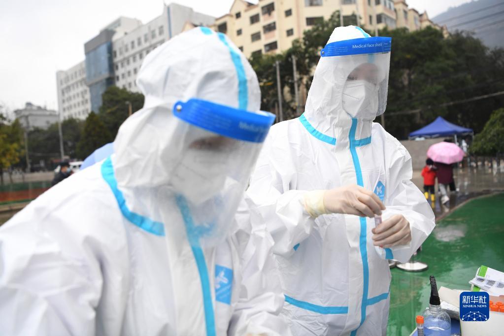 10月19日,在兰州市城关区民主西路小学核酸检测点,医务人员为居民做核酸检测。新华社记者 陈斌 摄