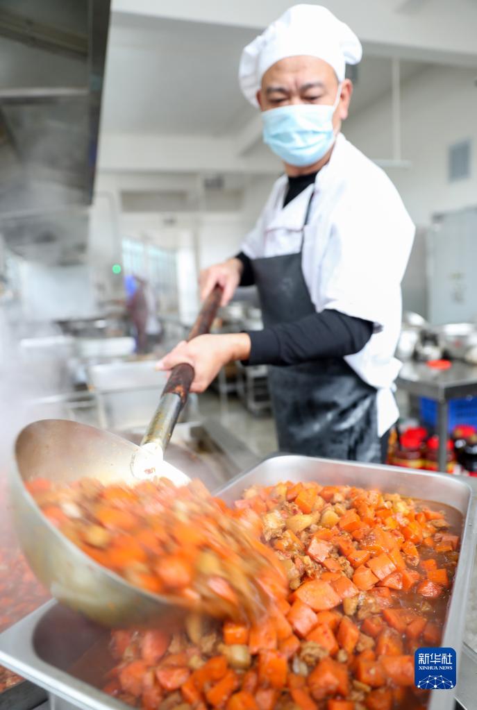 10月19日,四川省华蓥市高兴镇小学食堂的工作人员在烹制菜肴。新华社发(邱海鹰 摄)