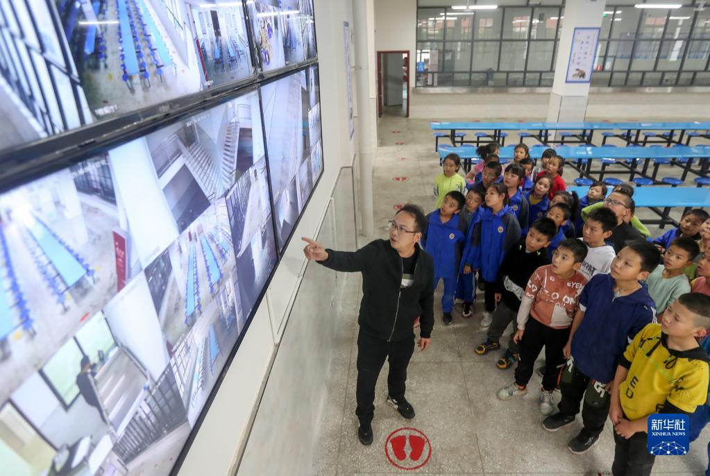 10月19日,四川省华蓥市高兴镇小学工作人员指导学生在屏幕上查看食堂操作流程。新华社发(邱海鹰 摄)