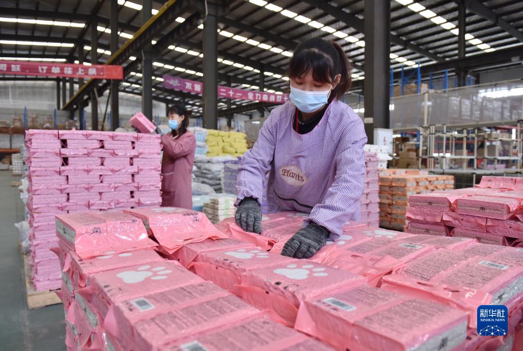 10月19日,河北省邢台市南和区河郭镇一家宠物产品电商企业工作人员在整理猫砂。