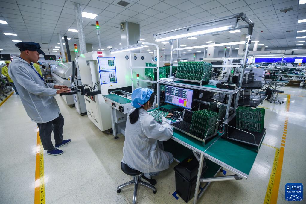 10月20日,在位于诸暨市浣东街道的浙江大豪科技有限公司的数字化车间内,自动化流水线在生产刺绣机电脑控制系统的元件。