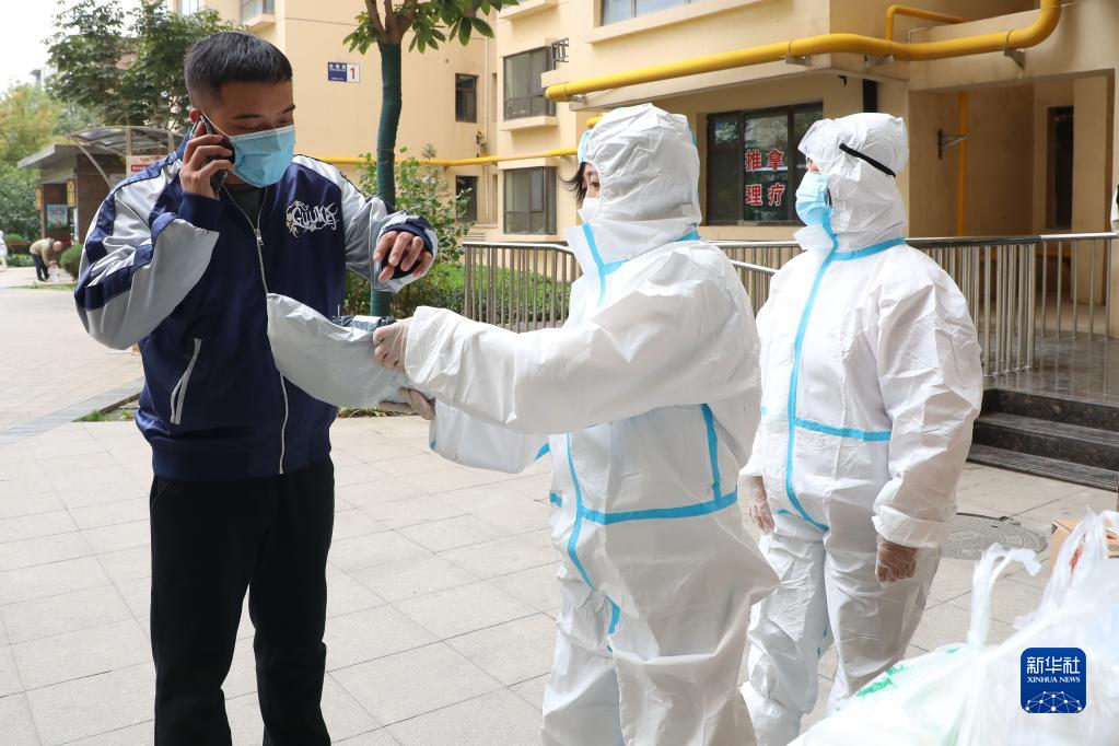 10月20日,在因疫情封控的兰州市七里河区光明苑小区内,志愿者(穿防护服者)把快递转交给住户。