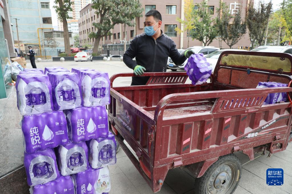 10月20日,在因疫情封控的兰州市七里河区光明苑小区外,便利店工作人员为该小区配送矿泉水。
