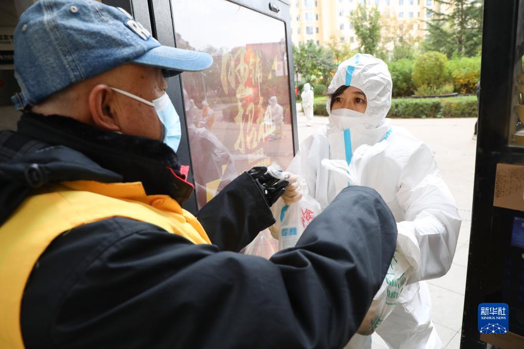 10月20日,在因疫情封控的兰州市七里河区光明苑小区门口,志愿者向小区内的志愿者(右)移交生活物资。