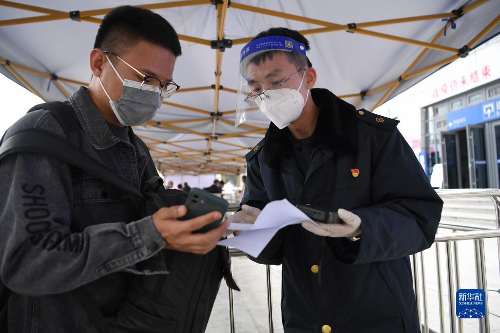 10月20日,在兰州火车站,出省旅客(左)持24小时内核酸检测证明及健康码进站乘车。