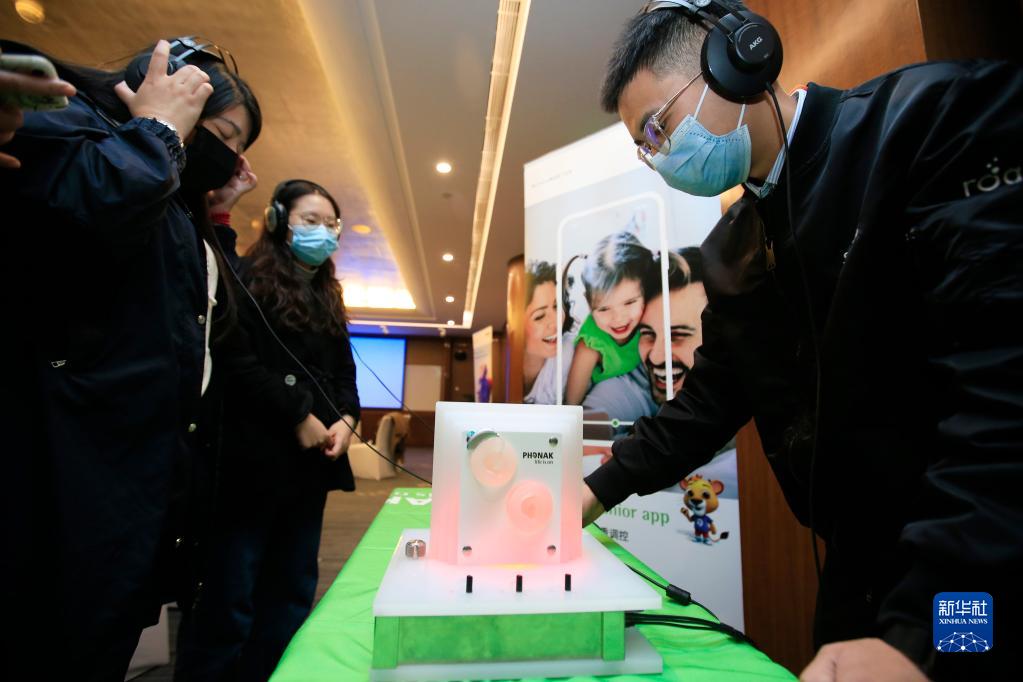 10月20日,媒体记者在发布会上体验大功率助听器的音质效果。