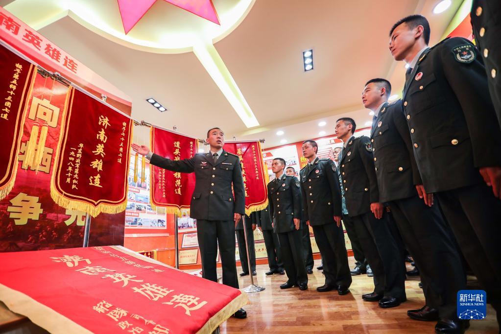 孙金龙(左一)在连队荣誉室为战士们讲解连队光荣传统(6月23日摄)。