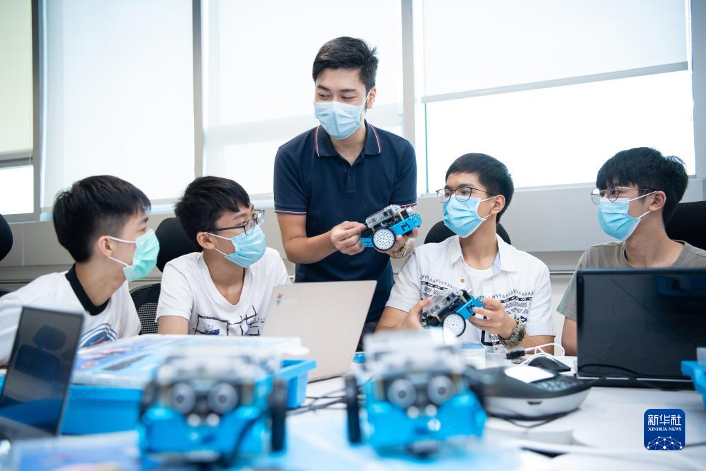 2020年7月14日,创业者吴以航在澳门青年创业孵化中心为学生上培训课。“80后”吴以航是澳门青年创业孵化中心会员,2019年,他进驻广州市天河区港澳青年之家,成立蓝点教育技术(广州)有限公司。新华社记者 张金加 摄