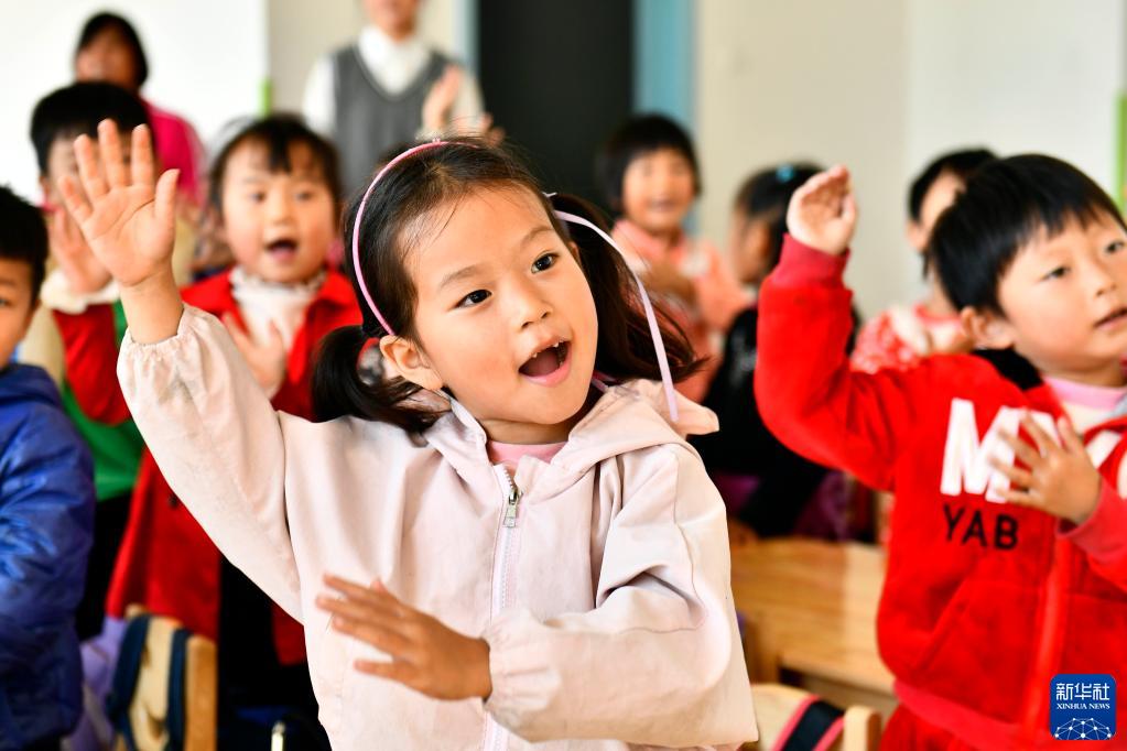 在山东省菏泽市东明县尚庄社区幼儿园,小朋友在学唱儿歌(10月12日摄)。