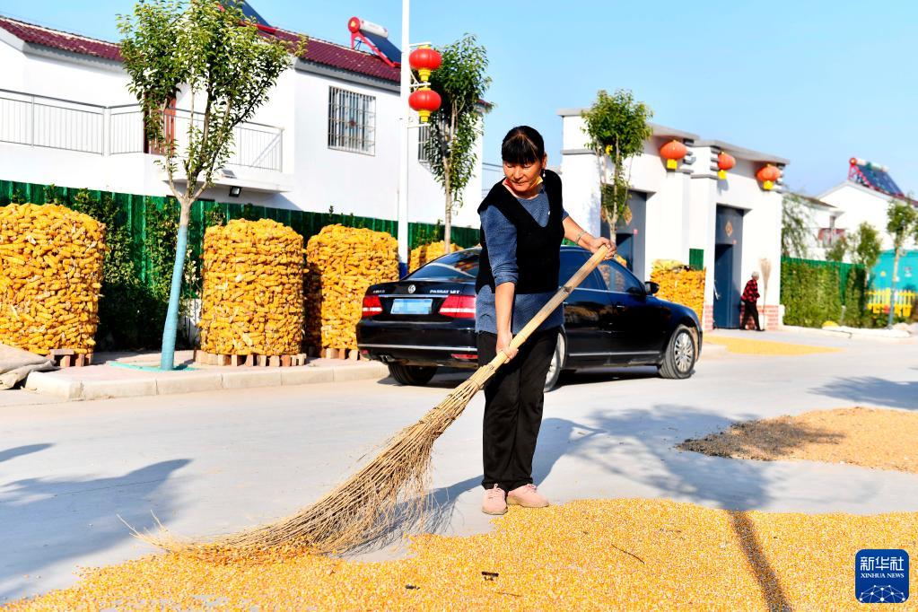 山东省菏泽市东明县尚庄社区居民在晾晒玉米(10月12日摄)。