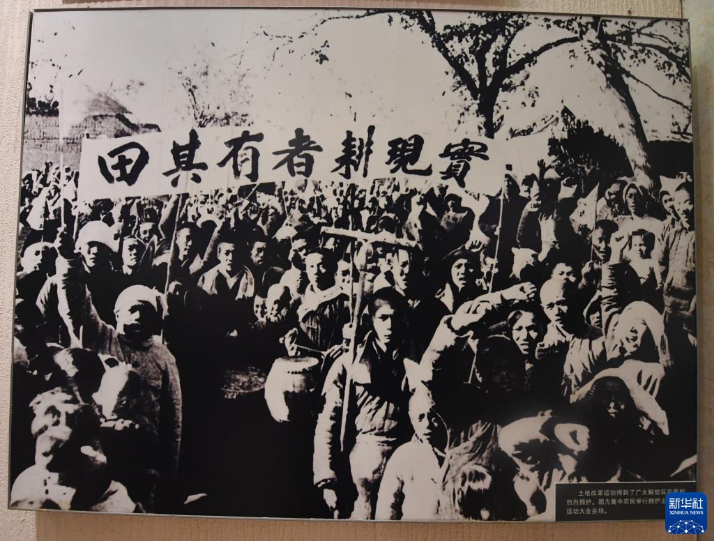 这是在西柏坡纪念馆拍摄的照片,反映的是冀中农民举行拥护土地改革运动大会(2019年4月9日摄)。