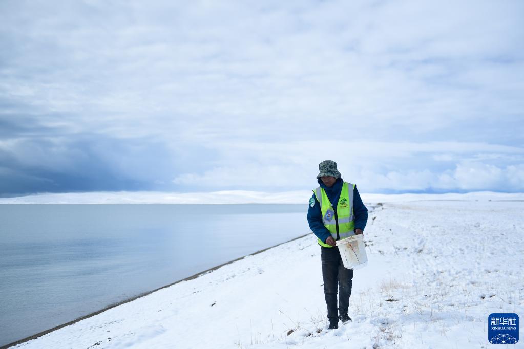 10月20日,在青海省果洛藏族自治州玛多县扎陵湖乡勒那村,三江源国家公园黄河源园区生态管护员俄措在扎陵湖边捡拾垃圾。