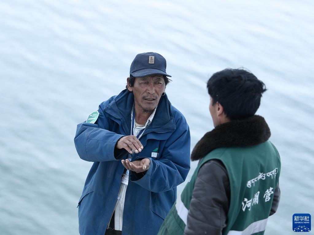 10月20日,在青海省果洛藏族自治州玛多县扎陵湖乡勒那村,三江源国家公园黄河源园区生态管护员安才(左)与队友所尼在扎陵湖畔巡护。