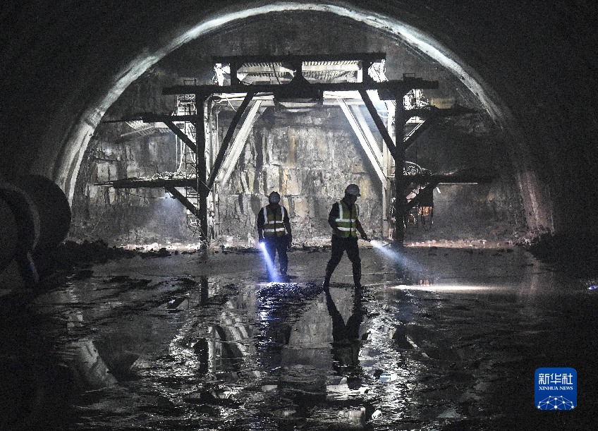 在新建的防城港至东兴铁路铜鼓岭隧道内,工人进行现场安全巡查(10月20日摄)。