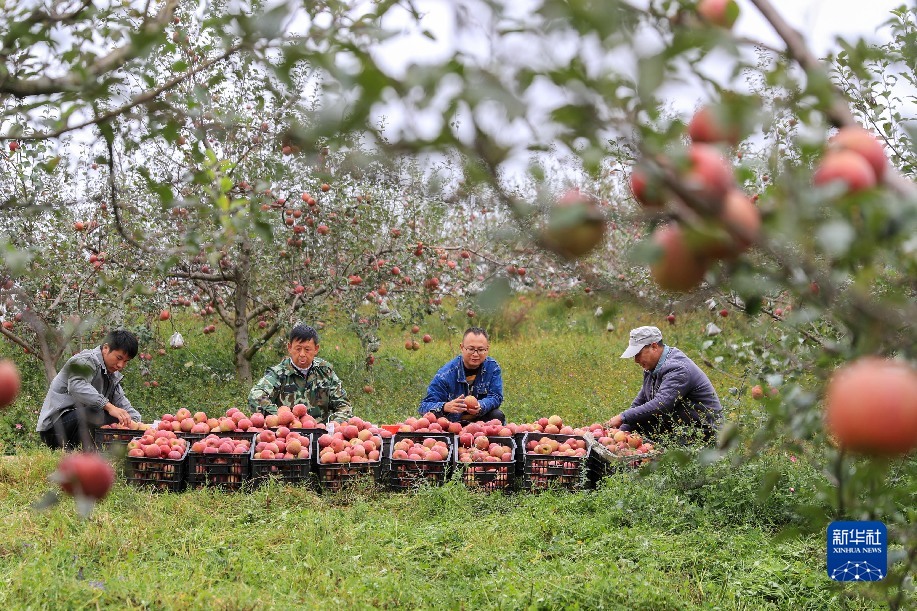 10月21日,在贵州省威宁彝族回族苗族自治县牛棚镇龙山种植专业合作社的苹果园,曹杰(右二)和父亲曹宣明(左二)将刚采摘的糖心苹果装筐。新华社发(韩贤普 摄)
