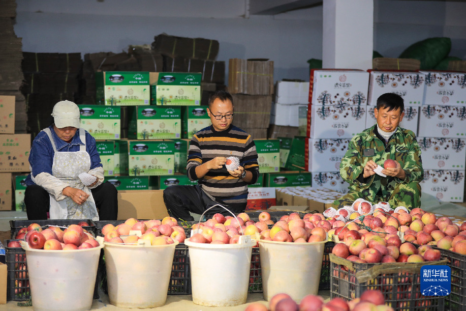 10月21日,在贵州省威宁彝族回族苗族自治县牛棚镇龙山种植专业合作社,曹杰(中)和父亲曹宣明(右)在分拣刚采摘的糖心苹果。新华社发(韩贤普 摄)