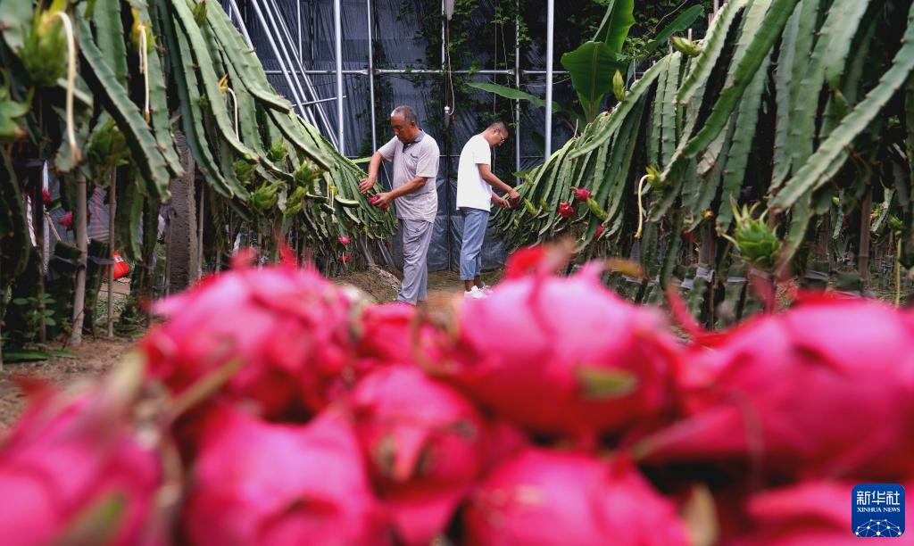 新河县五里铺村火龙果种植基地的工作人员在采摘火龙果(9月17日摄)。