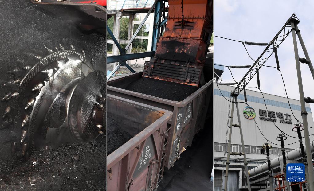 这是一张拼版照片,左图:10月20日,安徽省宿州市钱营孜煤矿工人开采电煤;中图:10月20日,在安徽省宿州市钱营孜煤矿,安徽铁道发展集团公司电煤专列装运电煤;右图:10月21日,皖能合肥发电有限公司将电能并入电网。新华社记者刘军喜摄