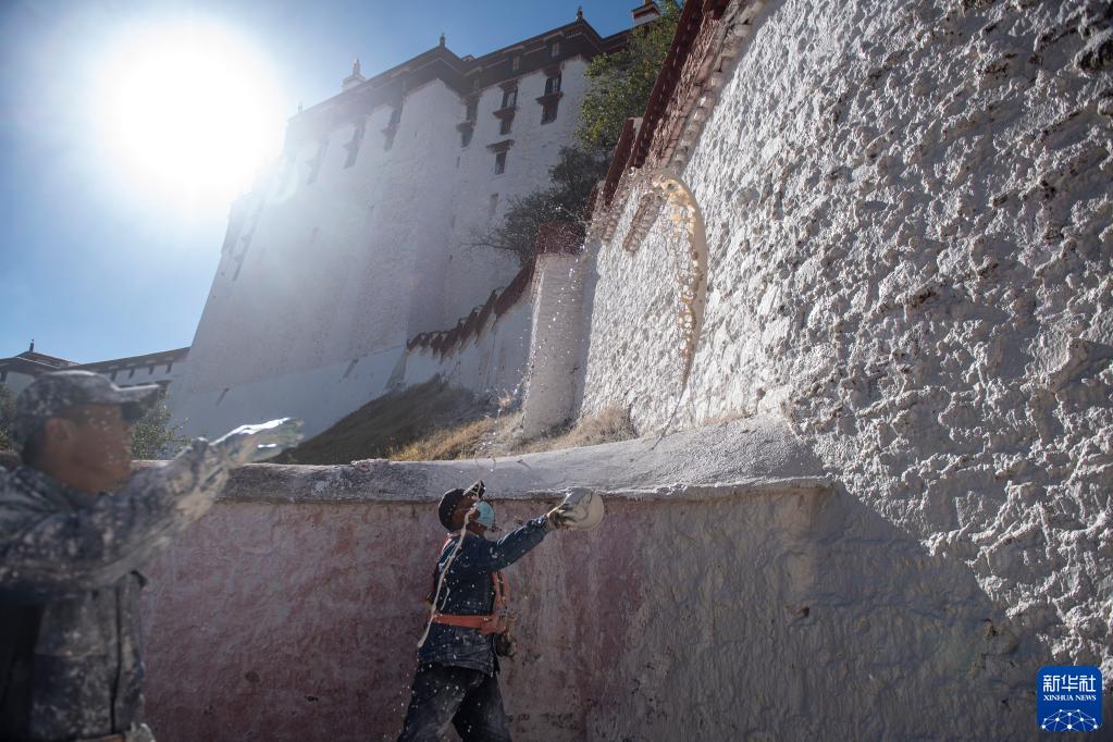 近日,西藏布达拉宫开启年度“换新装”工程。工作人员将牛奶、蜂蜜、藏红花、白灰等材料混合,经过滤后对布宫墙体进行喷涂,人力难以抵达的地方由专业人员在空中喷洒涂料,将这座宏伟宫殿的墙体粉刷一新。