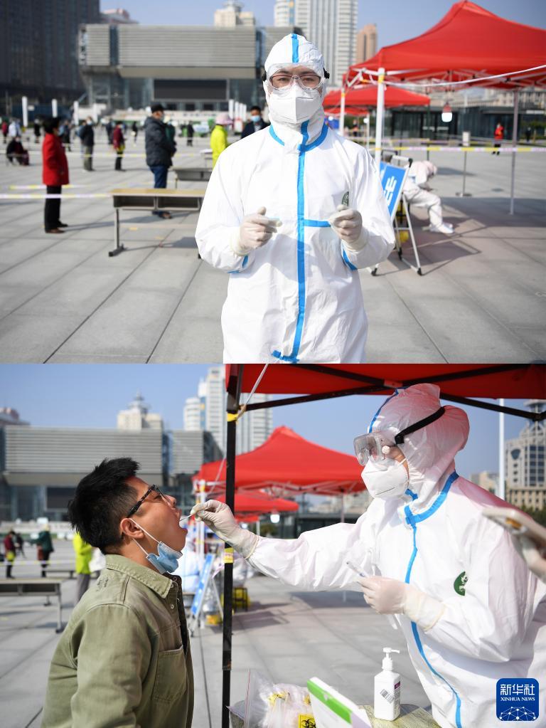 拼版照片:上图为甘肃省人民医院医务人员高婷婷在兰州市城关区东方红广场核酸检测点;下图为高婷婷(右)在核酸检测点为市民核酸采样(10月22日摄)。