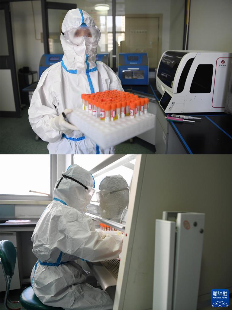 拼版照片:上图为兰州大学第二医院检验医学中心检验师彭玲玲在核酸检测实验室;下图为彭玲玲在核酸检测实验室核对标本编号(10月21日摄)。