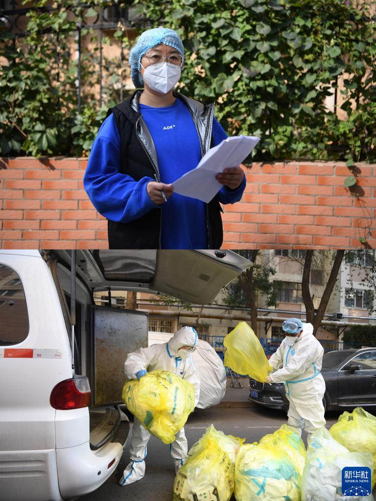 拼版照片:上图为兰州市城关区铁路西村街道工作人员沈丽辉在疫情防控一线接班前留影;下图为沈丽辉(左)和同事在受疫情原因封控管理的云祥小区外清理运送医疗废物(10月22日摄)。
