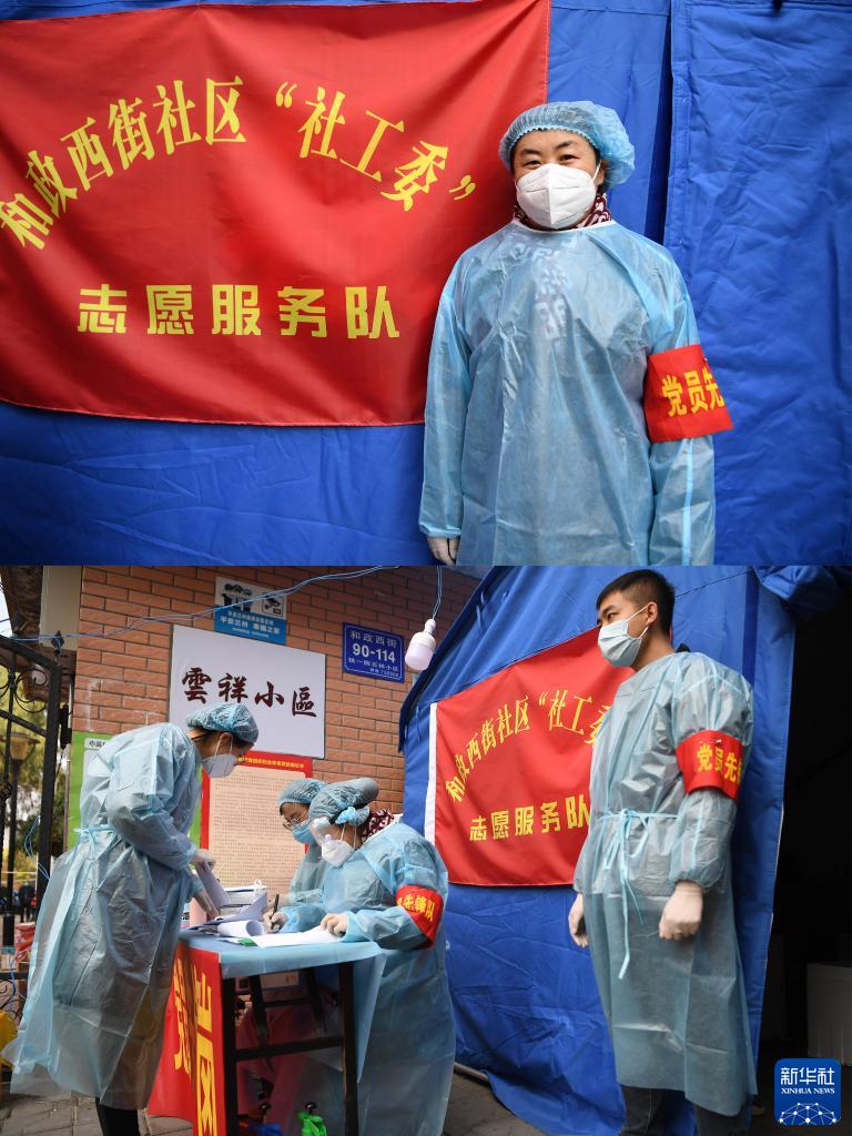 拼版照片:上图为兰州市城关区和政西街社区干部段晓慧在受疫情原因封控管理的云祥小区外值班点;下图为段晓慧(右二)在值班点登记防疫信息。疫情发生后,段晓慧和同事第一批赶赴小区开展摸排登记工作(10月22日摄)。