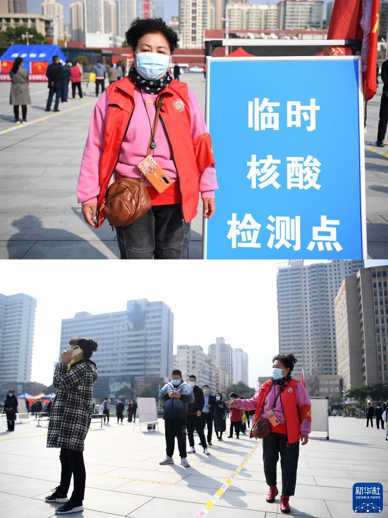 拼版照片:上图为兰州博盛公益慈善服务中心志愿者钟力在兰州市城关区东方红广场核酸检测点;下图为钟力(右一)在核酸检测点维持排队秩序(10月22日摄)。
