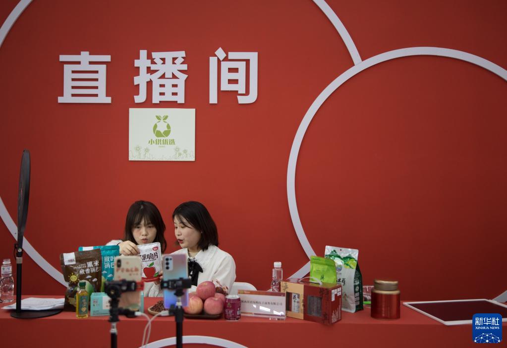 10月22日,在第28届中国杨凌农高会上,两名主播在陕西供销馆内直播。