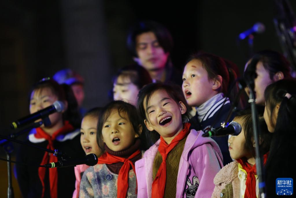 在大南坡村艺术中心广场,村里的小朋友在舞台上表演合唱(10月21日摄)。