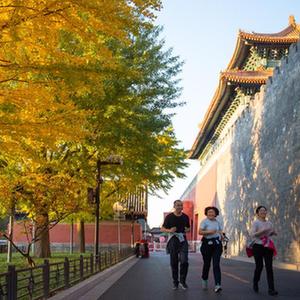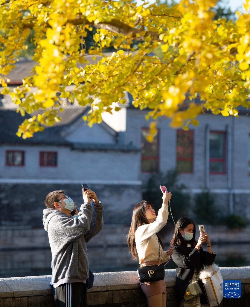 近日,北京秋意渐浓,在故宫西华门附近的宫墙下,几棵银杏树的树叶已是金灿灿的黄色,不少市民游客趁秋色在此拍照打卡、娱乐休闲。