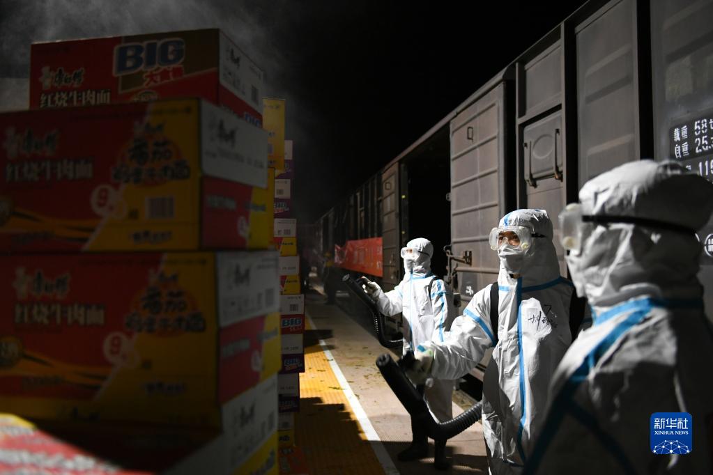 当日18时许,41301次列车到达内蒙古额济纳站。该车于当日凌晨从内蒙古巴彦淖尔市临河站发车,运载着价值100多万元的生活物资及各类医用防疫物资,这些物资由巴彦淖尔市临河区政府筹措并捐赠,支援额济纳旗疫情防控工作。新华社记者 贝赫 摄