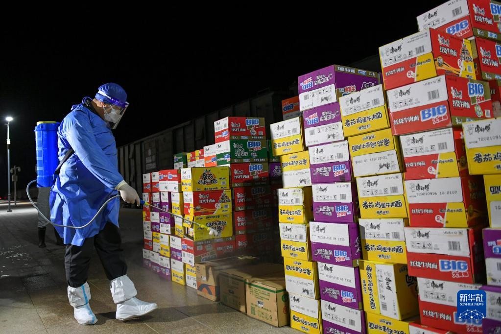 当日18时许,41301次列车到达内蒙古额济纳站。该车于当日凌晨从内蒙古巴彦淖尔市临河站发车,运载着价值100多万元的生活物资及各类医用防疫物资,这些物资由巴彦淖尔市临河区政府筹措并捐赠,支援额济纳旗疫情防控工作。新华社记者 贝赫 摄