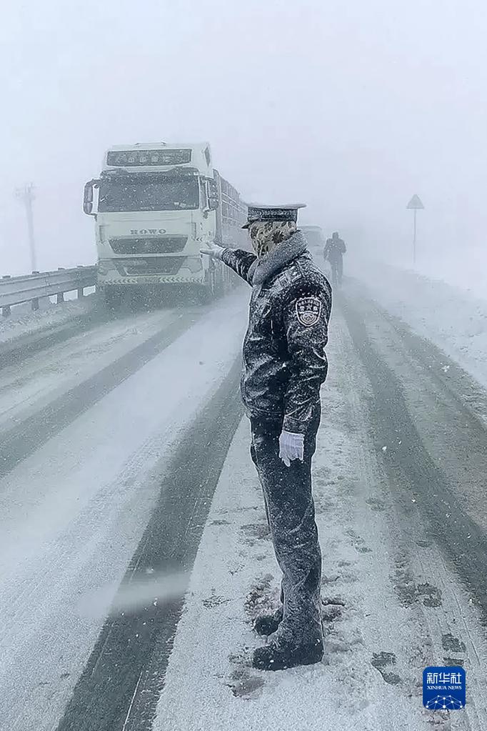 折多山交通管理警务站辅警白玛木洛在国道318线折多山路段冒雪执勤,全身落满冰雪的他仿佛一座“雪雕”(3月7日摄)。